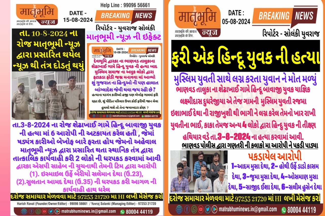 માતૃભૂમી ન્યૂઝ દ્વારા તા.10-08-2024 ના રોજ એક સમાચાર પ્રસારિત કરેલ કે શેઢાખાઈ ગામે હિન્દૂ યુવક ની હત્યા બાદ મુસ્લિમ સમાજ ના અમુક લોકો દ્વારા ફટાકડા ફોડી જશ્ન માનવવા માં આવ્યો અને હત્યા ના ષડ્યંત્ર કારીઓ હજી પણ બેખોફ બહાર ફરે છે, સમાચાર પ્રસારિત થતા તંત્ર દોડતું થયું અને તા,14-08-2024 ના રોજ અન્ય 2 આરોપીઓ (1). ઇસ્માઇલ ઉર્ફે બેરીયો સલેમાન દેથા (ઉ.23) અને (2).સુલતાન આમદ દેથા (ઉ.35) ની દ્વારકા પોલીસ દ્વારા અટકાયત કરવામાં આવી,
